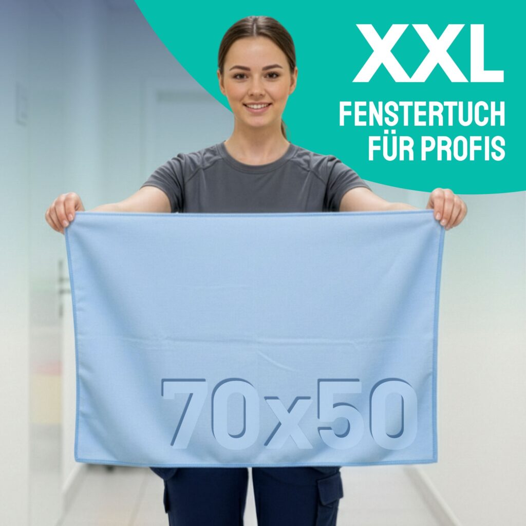 Dank des großzügigen XL-Formats (50 x 70 cm) lassen sich auch große Glasfronten, Duschkabinen oder gewerbliche Fensterflächen ohne häufiges Auswringen in einem Zug trocknen.